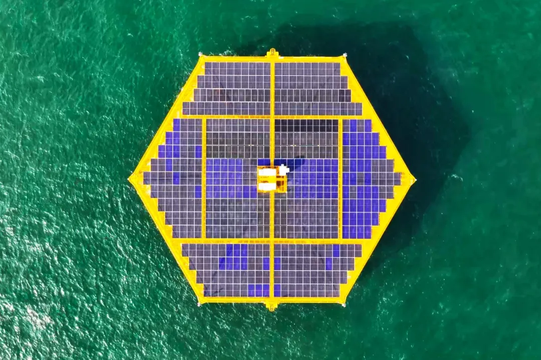 ▲我国首个抗浪型漂浮式海上光伏平台华能“黄海一号”